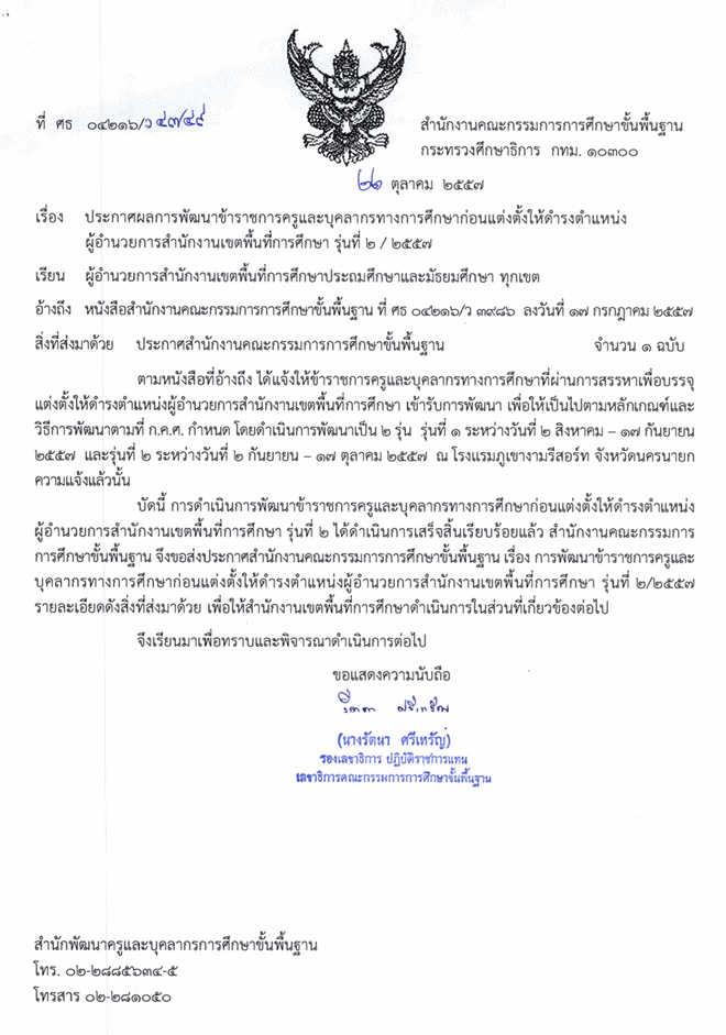 ประกาศผลการพัฒนาข้าราชการครูและบุคลากรทางการศึกษาก่อนแต่งตั้งให้ดำรงตำแหน่งผู้อำนวยการสำนักงานเขตพื้นที่การศึกษา รุ่นที่ 2/2557