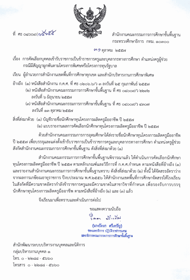 ที่ ศธ 04009/ว4655 การคัดเลือกบุคคลเข้ารรับราชการเป็นข้าราชการครูและบุคลากรทางการศึกษา ตำแหน่งครูผู้ช่วย กรณีมีสัญญาผูกพันตามโครงการทุนรัฐบาล