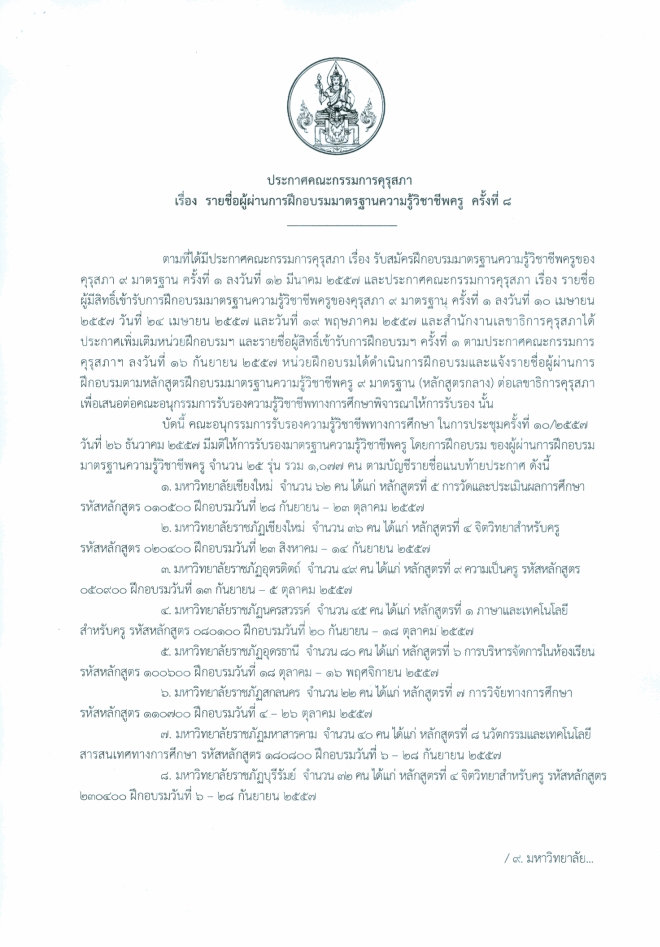 ❝ ประกาศคณะกรรมการคุรุสภา เรื่อง รายชื่อผู้ผ่านการฝึกอบรมมาตรฐานความรู้วิชาชีพครู ครั้งที่ 8 ❞