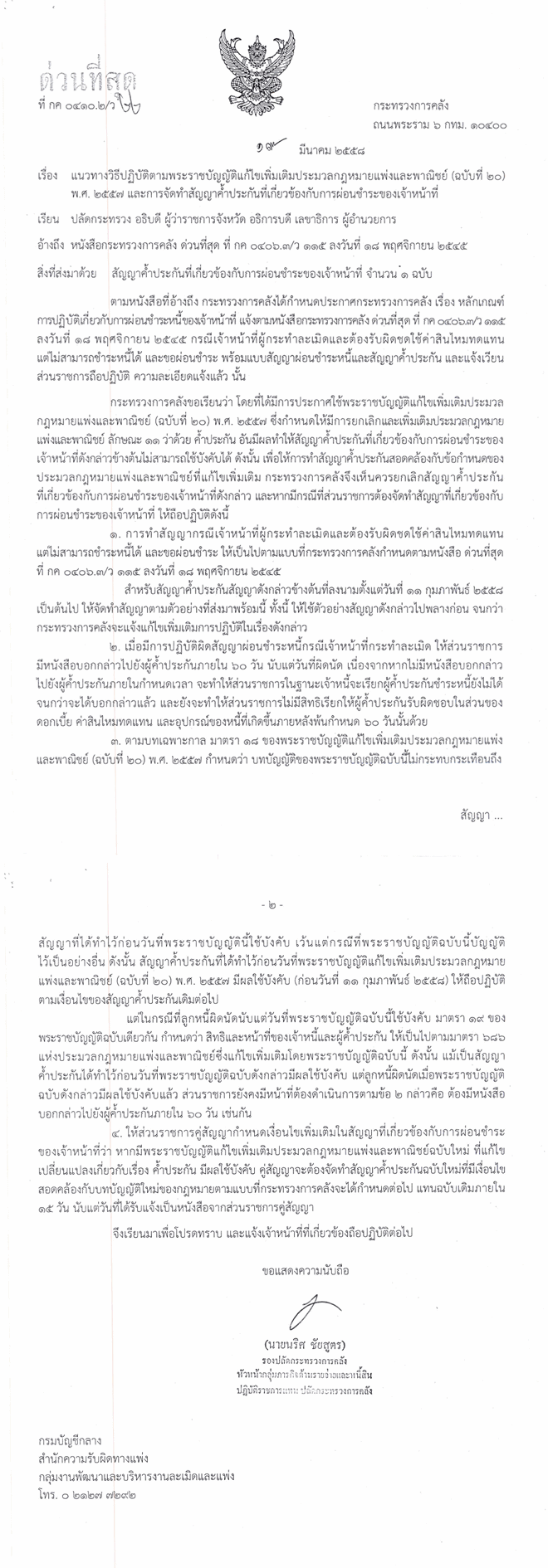 แนวทางวิธีปฏิบัติตามพระราชบัญญัติแก้ไขเพิ่มเติมประมวลกฎหมายแพ่งและพาณิชย์ (ฉบับที่ ๒๐) พ.ศ. ๒๕๕๗ และการจัดทำสัญญาค้ำประกันที่เกี่ยวข้องกับการผ่อนชำระของเจ้าหน้าที่
