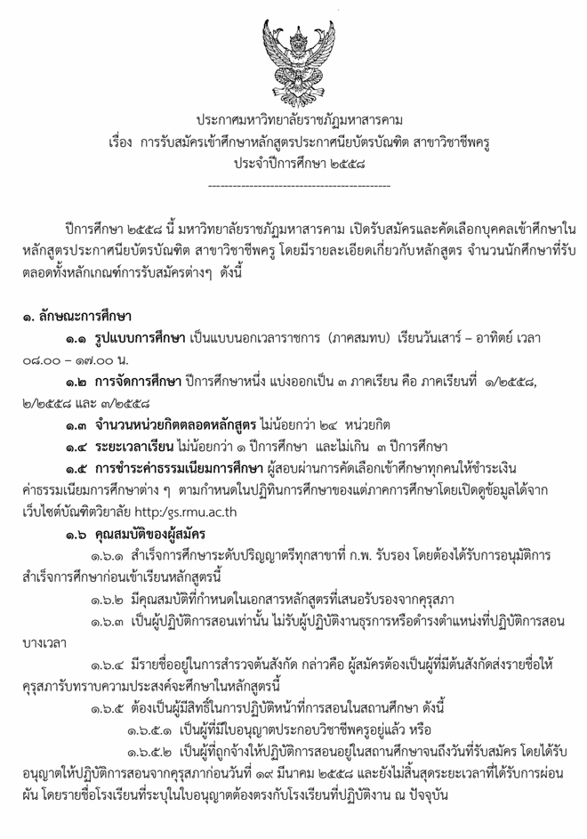 ปีการศึกษา 2558 นี้ มหาวิทยาลัยราชภัฏมหาสารคาม เปิดรับสมัครและคัดเลือกบุคคลเข้าศึกษาใน หลักสูตรประกาศนียบัตรบัณฑิต สาขาวิชาชีพครู โดยมีรายละเอียดเกี่ยวกับหลักสูตร จํานวนนักศึกษาที่รับ ตลอดทั้งหลักเกณฑ์การรับสมัครต่างๆ ดังนี้