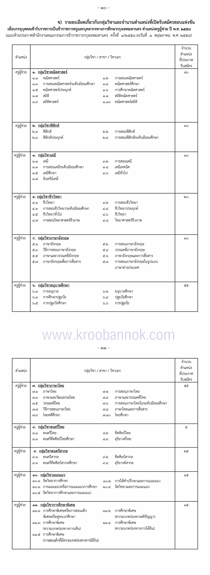 ครูบ้านนอกดอทคอม ขอนำเสนอรายละเอียดเกี่ยวกับกลุ่มวิชาและจำนวนตำแหน่งที่เปิดรับสมัครสอบแข่งขัน เพื่อบรรจุบุคคลเข้ารับราชการเป็นข้าราชการครูและบุคลากรทางการศึกษากรุงเทพมหานคร ตำแหน่งครูผู้ช่วย ปี พ.ศ. 2558 ว่ามีกลุ่มวิชา/สาขา/วิชาเอก ใดบ้างที่เปิดรับและสามารถสมัครสอบได้ในครั้งนี้ ดังรายละเอียด้านล่าง
