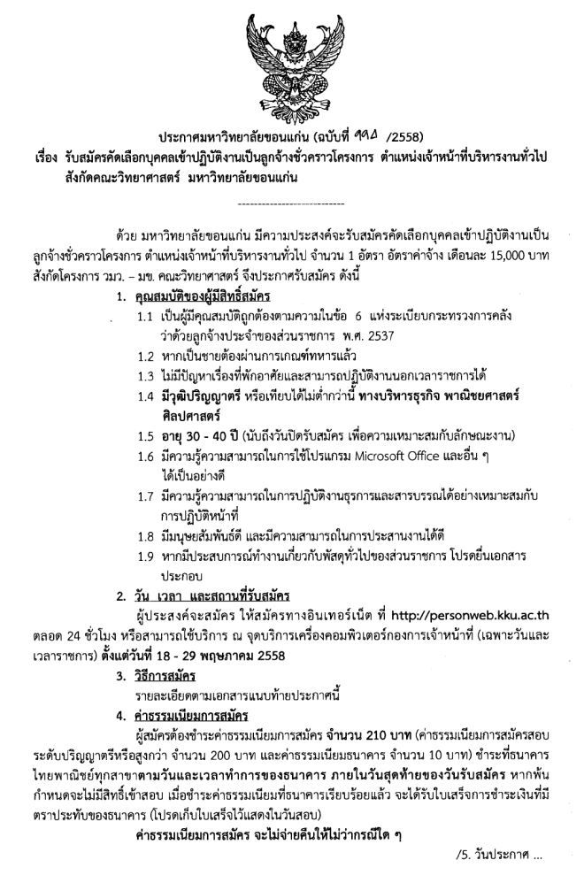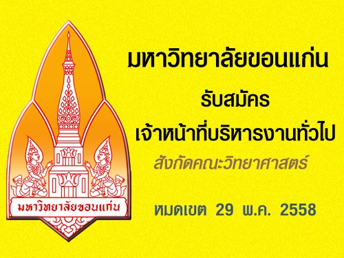 มข.รับสมัครเจ้าหน้าที่บริหารงานทั่วไป สังกัดคณะวิทยาศาสตร์ มหาวิทยาลัยขอนแก่น เปิดรับสมัคร 18 พ.ค. 2558 - 29 พ.ค. 2558