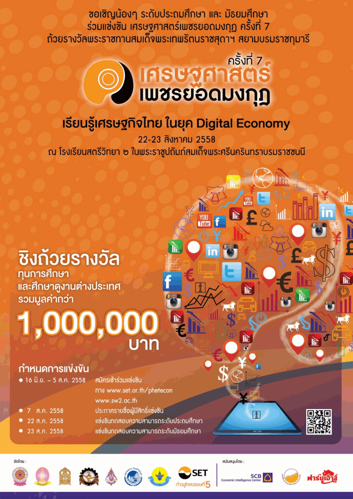 22 – 23 สิงหาคม 2558 ณ โรงเรียนสตรีวิทยา ๒ และระดับอุดมศึกษาระดับปริญญาตรีชั้นปีที่ 1-4 เปิดรับสมัครตั้งแต่วันที่ 3 ส.ค.- 25 ก.ย. 2558 แข่งขันวันที่ 11 ตุลาคม 2558 ติดตามรายละเอียดและสมัครที่ www.set.or.th/phetecon หรือสอบถาม SET Contact Center0 2229 2222