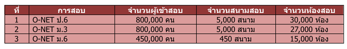 - ข้อมูลจำนวนผู้เข้าสอบในปีการศึกษา 2558 เนื่องจากระบบการส่งข้อมูลของผู้เข้าสอบ จะเปิดให้สถานศึกษาดำเนินการส่งข้อมูลนักเรียนในแต่ละระดับชั้น ผ่านระบบ O-NET / www.niets.or.th ผ่านเว็บไซต์ของ สทศ.ในระหว่างวันที่ 1 กรกฎาคม-31 สิงหาคม 2558 ซึ่งในปีการศึกษานี้ ก็คาดว่าจะมีผู้เข้าสอบใกล้เคียงปีที่ผ่านมา ดังนี้