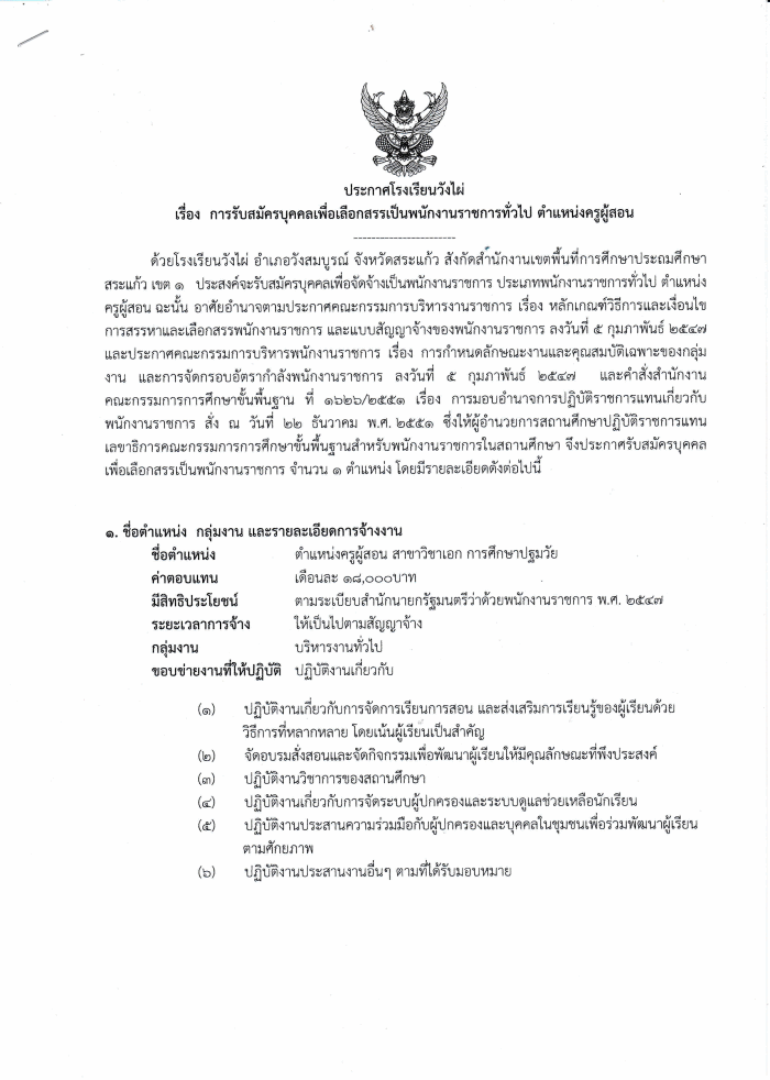 โรงเรียนวังไผ่ รับสมัครพนักงานราชการ เงินเดือน 18,000 บาท