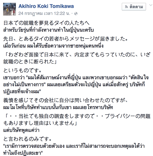 เมื่อวันที่ 24 กรกฎาคม 2558 ที่ผ่านมา เฟซบุ๊ก Akihiro Koki Tomikawa ของหนุ่มญี่ปุ่นที่เคยโพสต์เรื่องแท็กซี่ไทยที่สนามบินสุวรรณภูมิ มีการเขียนข้อความเตือนคนไทยที่กำลังหางานทำในญีปุ่นว่า ตอนนี้การสมัครงานบริษัทต่าง ๆ ล้วนตรวจสอบถึงเฟซบุ๊ก และสืบประวัติอย่างละเอียด ดังนั้นอาจจะไม่ได้งานเพราะเฟซบุ๊กได้