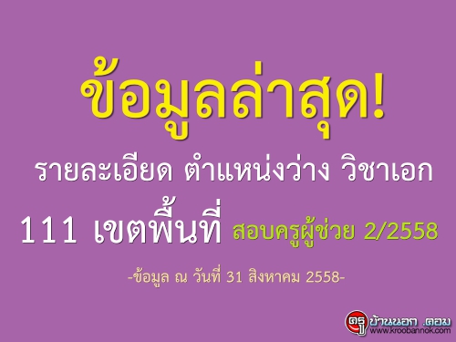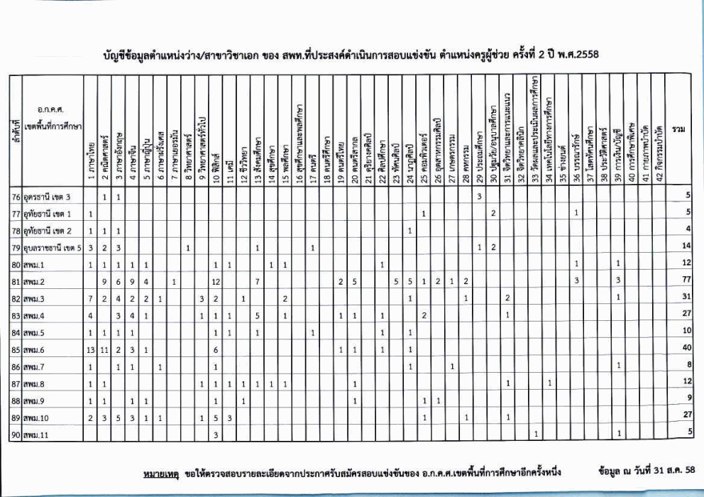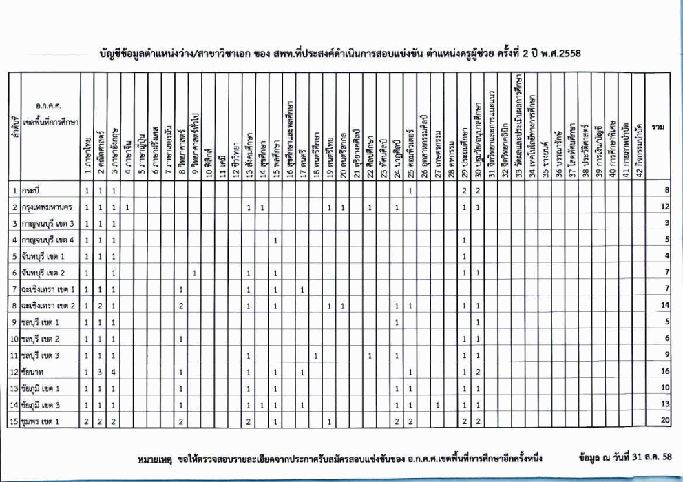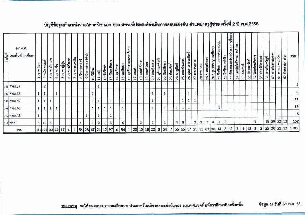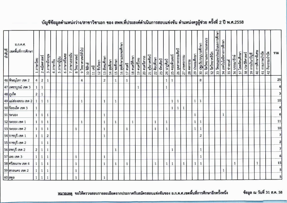 บัญชีข้อมูลตำแหน่งว่าง/สาขาวิชาเอก ของ สพท.ที่ประสงค์ดำเนินการสอบแข่งขัน ตำแหน่งครูผู้ช่วย ครั้งที่ 2 ปี พ.ศ. 2558 (ข้อมูล ณ วันที่ 31 ส.ค.58)