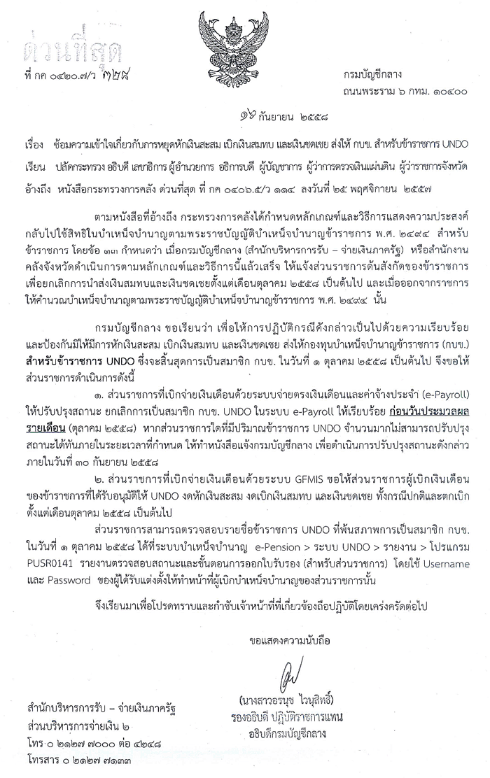 กรมบัญชีกลาง มีหนังสือ ที่ กค0420.7/328 ลงวันที่ 16 กันยายน 2558 เรื่อง ซ้อมความเข้าใจเกี่ยวกับการหยุดหักเงินสะสม เบิกเงินสมทบ และเงินชดเชย ส่งให้ กบข. สำหรับข้าราชการ UNDO