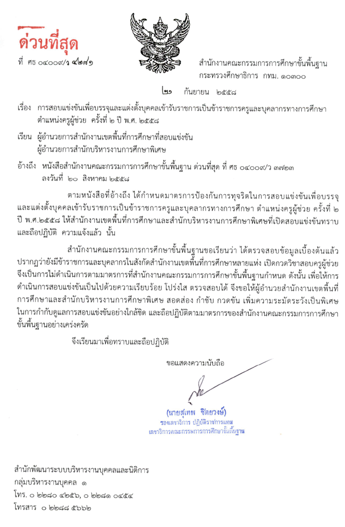 ด่วนที่สุด ที่ ศธ 04009/ว 4281 การสอบแข่งขันเพื่อบรรจุและแต่งตั้งบุคคลเข้ารับราชการเป็นข้าราชการครูและบุคลากรทางการศึกษา ตำแหน่งครูผู้ช่วย ครั้งที่ 2 ปี พ.ศ. 2558