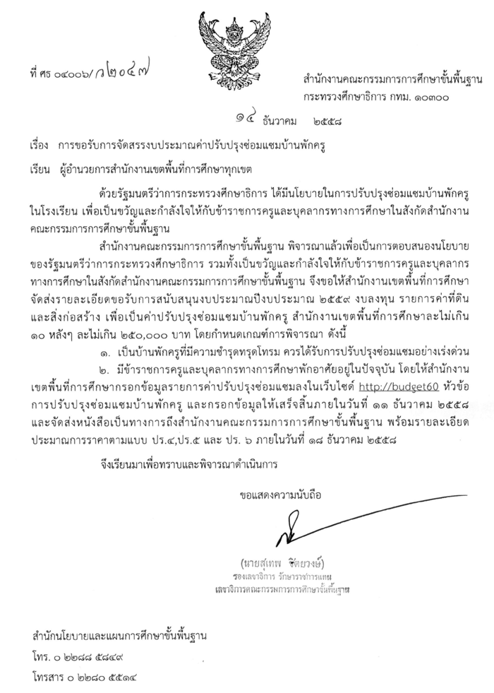ที่ ศธ 04006/ว2047 เรื่อง การขอรับการจัดสรรงบประมาณค่าปรับปรุงซ่อมแซมบ้านพักครู