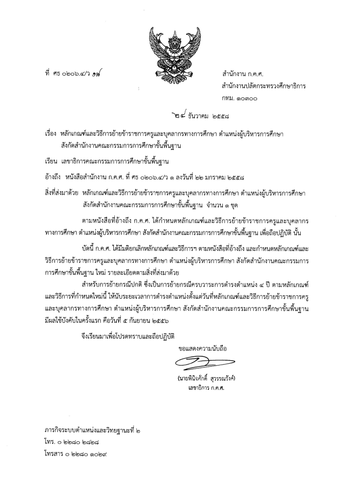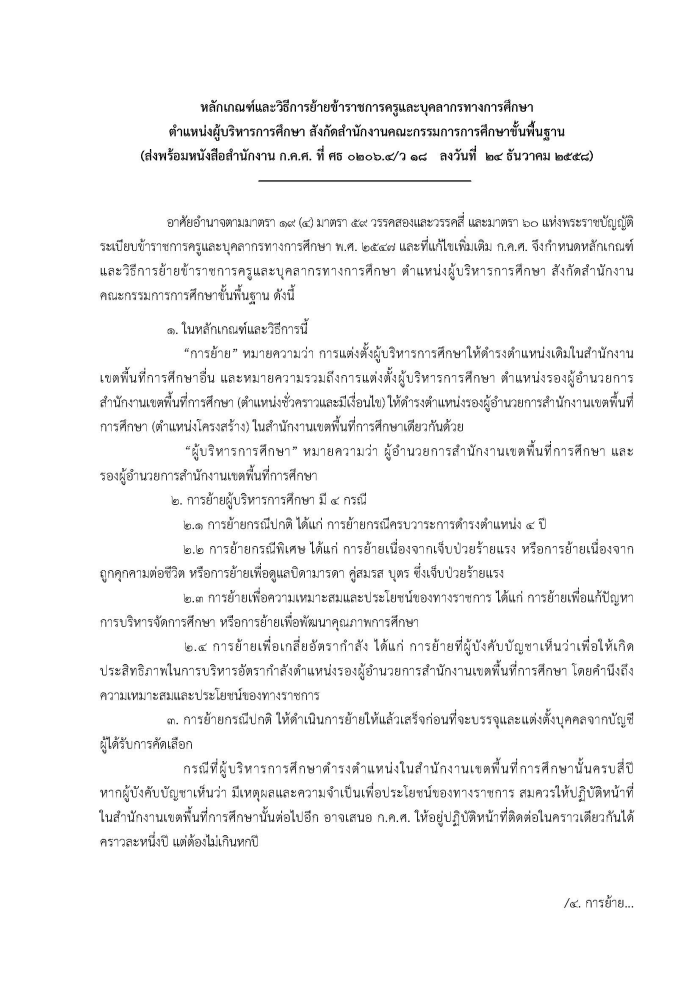 ว18/2558 หลักเกณฑ์และวิธีการย้ายข้าราชการครูและบุคลากรทางการศึกษา ตำแหน่งผู้บริหารการศึกษา สังกัดสำนักงานคณะกรรมการการศึกษาขั้นพื้นฐาน