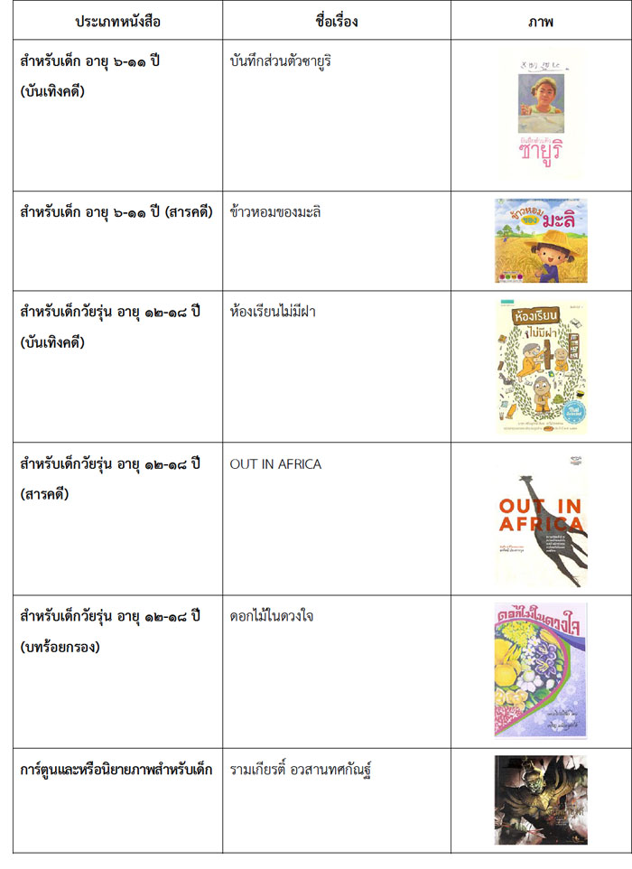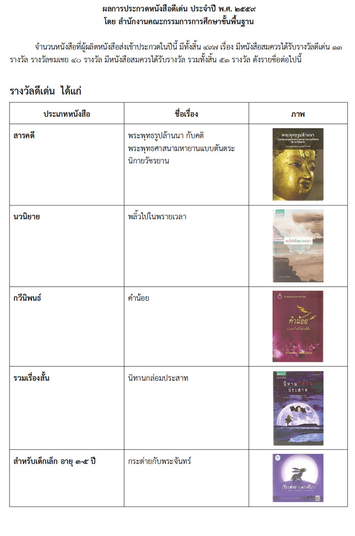 - ดูรายชื่อหนังสือ ที่ได้รับการประกาศผลรางวัลหนังสือดีเด่นในการประกวดหนังสือดีเด่น และรางวัลชมเชย ประจำปี 2559