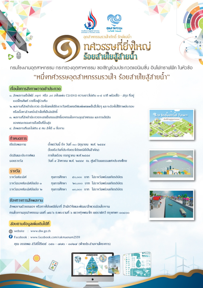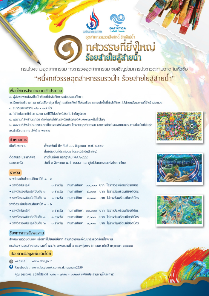 กรมโรงงานอุตสาหกรรม กระทรวงอุตสาหกรรม จัดกิจกรรม “รวมใจภักดิ์ รักษ์แม่น้ำ ปีที่10”จัดให้มีการประกวดภาพวาด สำหรับนักเรียนชั้นประถมศึกษา และแอนิเมชั่น อินโฟกราฟิก ความยาว 3-5 นาที สำหรับนิสิต นักศึกษา และประชาชนทั่วไป ในหัวข้อ “หนึ่งทศวรรษอุตสาหกรรมรวมใจ ร้อยสายใยสู่สายน้ำ” เพื่อชิงเงินรางวัลกว่า 120,000 บาท พร้อมโล่รางวัลและเกียรติบัตร เปิดรับผลงานตั้งแต่วันนี้ ถึงวันที่ 30 มิถุนายน 2559 ผู้สนใจสามารถส่งผลงานได้ด้วยตัวเอง หรือทางไปรษณีย์มาที่ กรมโรงงานอุตสาหกรรม ถนนพระรามที่ 6 เขตราชเทวี กรุงเทพฯ 10400 สอบถามเพิ่มเติมโทร 02-202-4001 พร้อมติดตามรายละเอียดการเข้าร่วมประกวดได้ที่ www.diw.go.th หรือ www.facebook.com/rakmaenam2559
