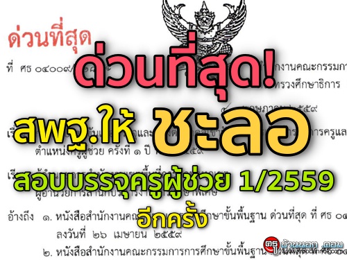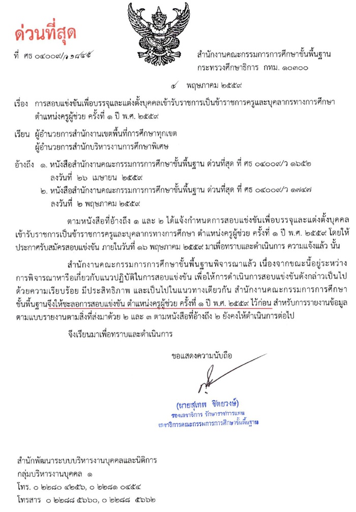 ด่วนที่สุด ที่ ศธ 04009/ว 1845 ลงวันที่ 4 พฤษภาคม 2559 เรื่อง การสอบแข่งขันเพื่อบรรจุและแต่งตั้งบุคคลเข้ารับราชการเป็นข้าราชการครูและบุคลากรทางการศึกษา ตำแหน่งครูผู้ช่วย ครั้งที่ 1 ปี พ.ศ.2559