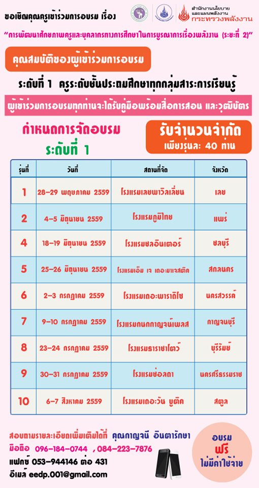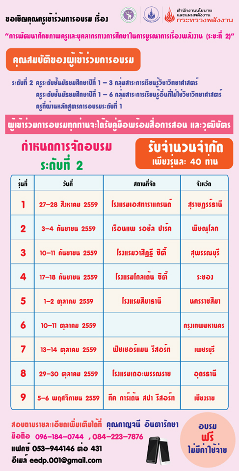 มหาวิทยาลัยเชียงใหม่ได้รับมอบหมายจาก สำนักงานนโยบายและแผนพลังงาน กระทรวงพลังงาน เพื่อจัดการอบรม เรื่อง การพัฒนาศักยภาพครูและบุคคลากรทางการศึกษาในการบูรณาการเรื่องพลังงาน (ระยะที่ 2 ) โดยมีการจัดการอบรมตามจังหวัดต่างๆ ดังตาราง จึงประชาสัมพันธ์มายังคุณครูสนใจเข้าร่วมอบรมสามารถกรอกแบบตอบรับและส่งมายังโครงการ ที่อีเมลล์ eedp.001@gmail.com โทรศัพท์ 096-1840744, 084-2237876 โทรสาร 053-944146 ต่อ 431