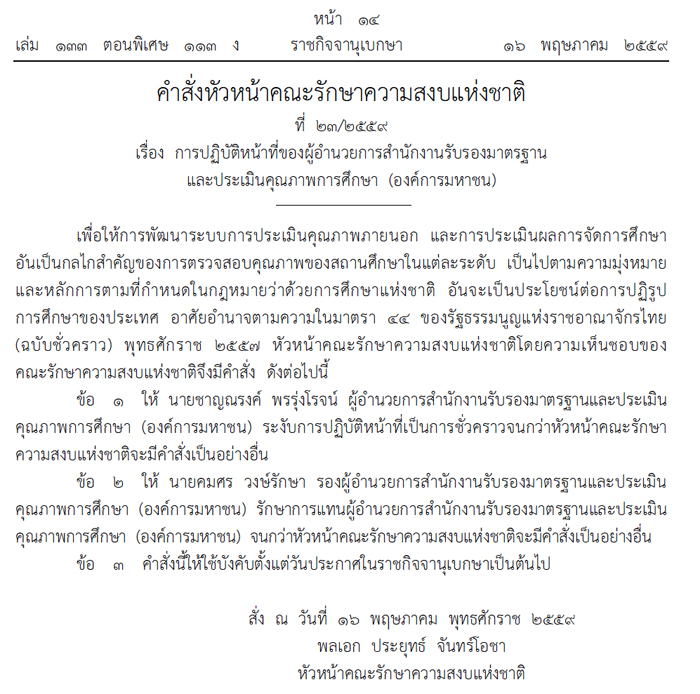 วันที่ 16 พฤษภาคม 2559 เว็บไซต์ราชกิจจานุเบกษา ได้เผยแพร่ คำสั่งหัวหน้าคณะรักษาความสงบแห่งชาติ ที่ 23/2559 เรื่อง การปฏิบัติหน้าที่ของผู้อำนวยการสำนักงานรับรองมาตรฐานและประเมินคุณภาพการศึกษา (องค์การมหาชน) รายละเอียด ดังนี้