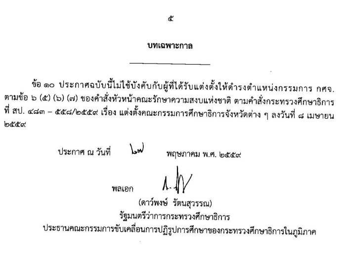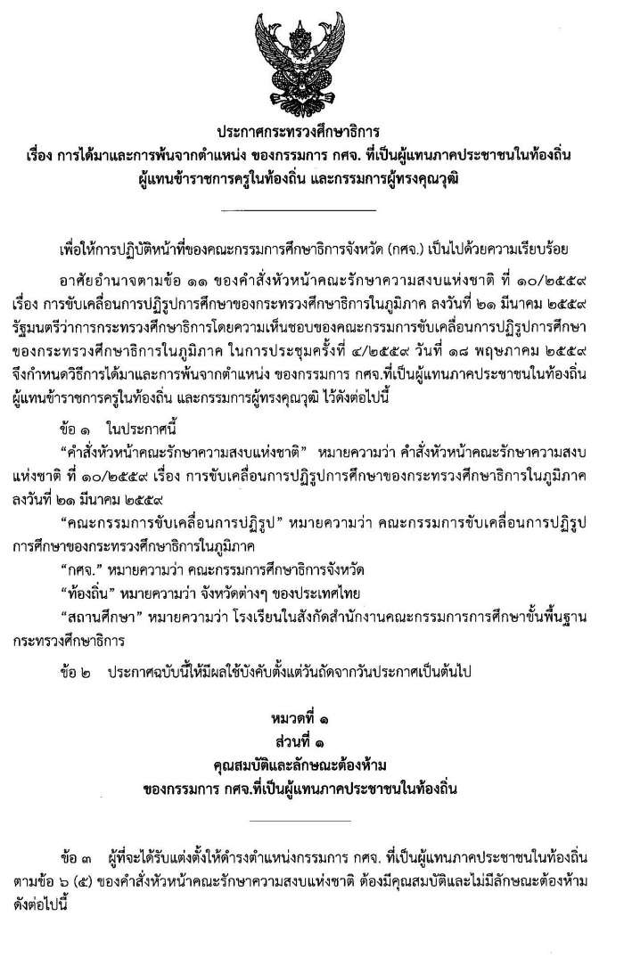 ประกาศกระทรวงศึกษาธิการ เรื่อง การได้มาและการพ้นจากตำแหน่ง ของคณะกรรมการ กศจ. ที่เป็นผู้แทนภาคประชาชนในท้องถิ่นผู้แทนข้าราชการครูในท้องถิ่น และกรรมการผู้ทรงคุณวุฒิ (ลงนาม ณ วันที่ 27 พฤษภาคม 2559)