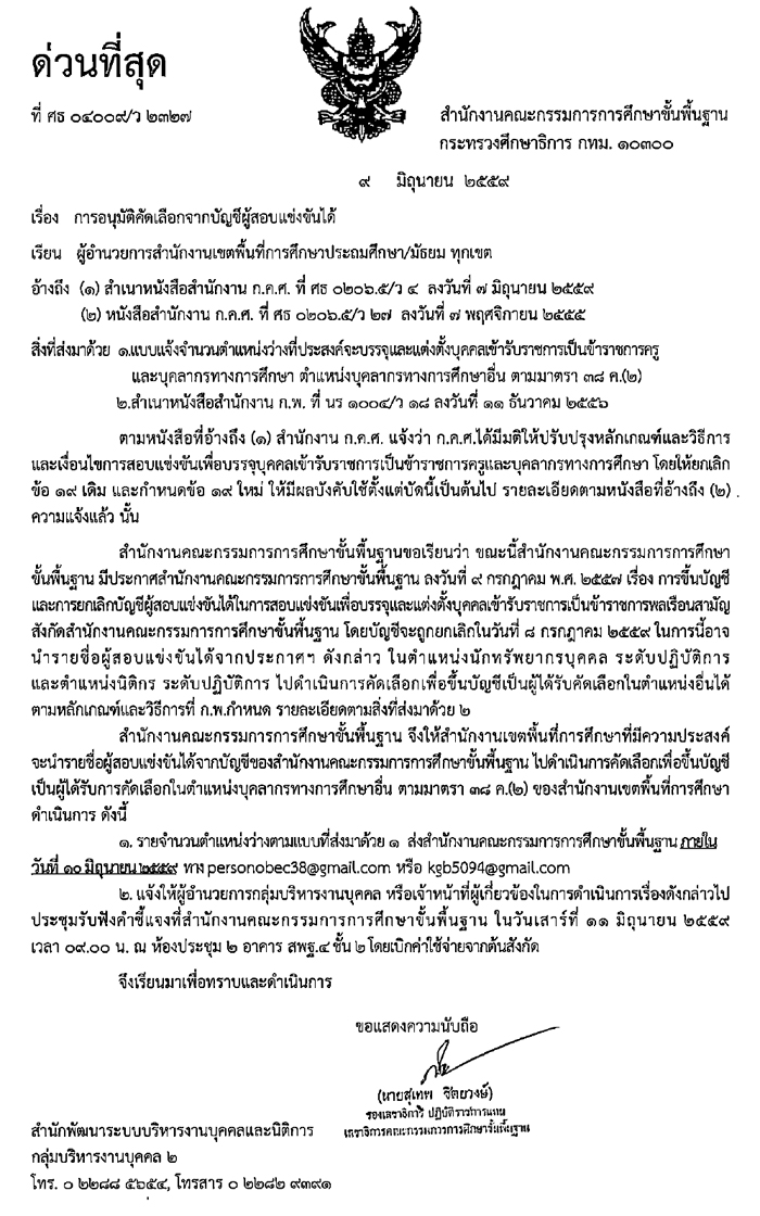 สำนักงานคณะกรรมการการศึกษาขั้นพื้นฐาน มีหนังสือ ที่ ศธ 04009/ว2327 เรื่อง การอนุมัติคัดลือกจากบัญชีผู้สอบแข่งขันได้ ลงวันที่ 9 มิถุนายน 2559 ถึงสำนักงานเขตพื้นที่การศึกษาทุกเขต รายละเอียดดังนี้