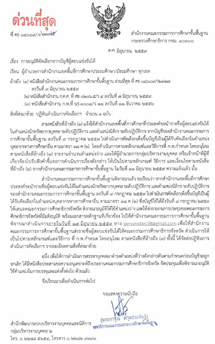 สำนักงานคณะกรรมการการศึกษาขั้นพื้นฐาน มีหนังสือ ที่ ศธ 04009/ว2375 เรื่อง การอนุมัติคัดเลือกจากบัญชีผู้สอบแข่งขันได้ แจ้งไปยังสำนักงานเขตพื้นที่การศึกษาทุกเขต รายละเอียด ดังนี้