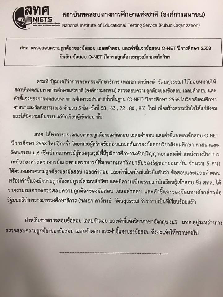 แถลงข่าวจาก สทศ. กรณีข้อพิพาทข้อสอบ O-NET