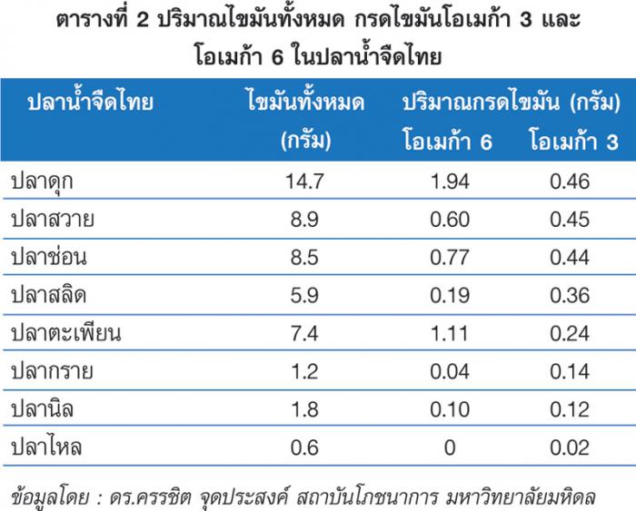 รศ.ครรชิต จุดประสงค์ จากสถาบันโภชนาการ มหาวิทยาลัยมหิดล ผู้ทำวิจัยเรื่อง “ปริมาณไขมันทั้งหมด กรดโอเมก้า 6 และกรดโอเมก้า 3 ในปลาทะเลและปลาน้ำจืดของไทย” ให้ข้อมูลว่าจากการศึกษาทำให้ทราบว่าทั้งปลาน้ำจืดและปลาทะเลของไทยก็ล้วนมีโอเมก้าไม่แพ้กัน เพียงแต่ปลาน้ำจืดต้องเป็นปลาเลี้ยงเท่านั้น เนื่องจากโดยทั่วไปกรดไขมันไม่อิ่มตัว อย่างโอเมก้า 3 และ 6 จะพบเฉพาะในปลาทะเลน้ำลึกอย่างแซลมอน เพราะจะสร้างและสะสมไขมันจากการกินแพลงตอนทะเล ดังนั้นในปลาน้ำจืดจึงไม่พบเลย