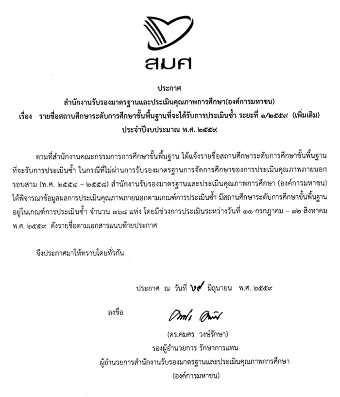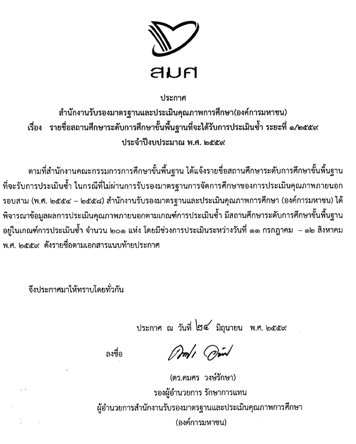 ประกาศเรื่อง : รายชื่อสถานศึกษาระดับการศึกษาขั้นพื้นฐานที่จะได้รับการประเมินซ้ำ ระยะที่ 1/2559 (เพิ่มเติม) ประจำปีงบประมาณ พ.ศ.2559