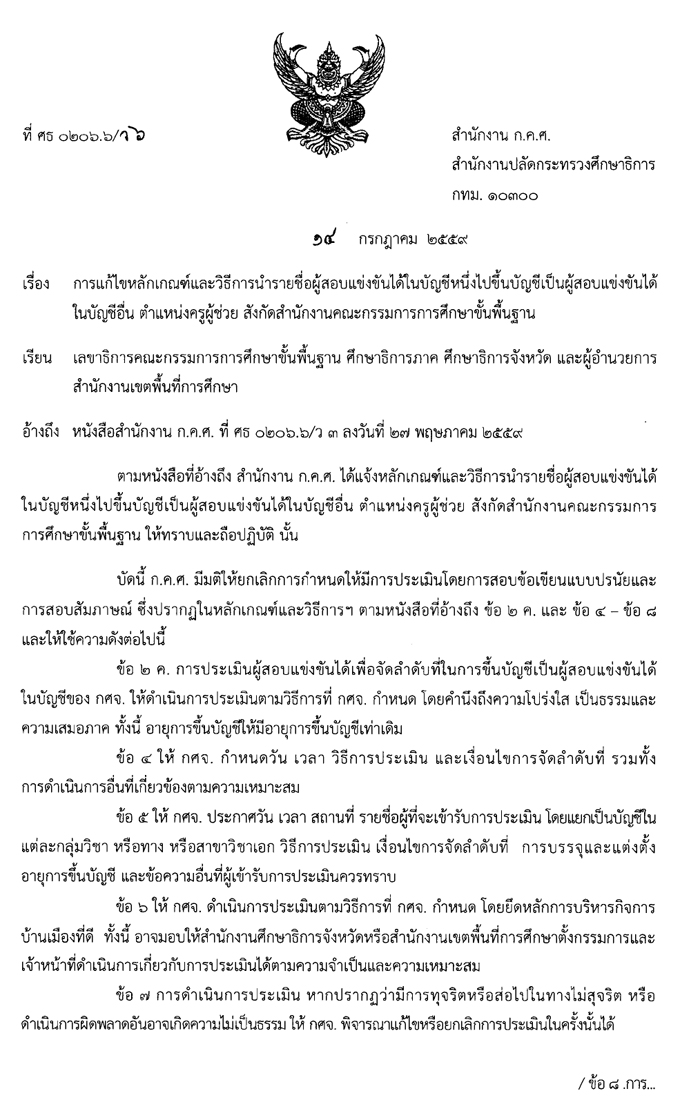 [ศธ 0206.6/ว6] การแก้ไขหลักเกณฑ์และวิธีการนำรายชื่อผู้สอบแข่งขันได้ในบัญชีหนึ่งไปขึ้นบัญชีเป็นผู้สอบแข่งขันได้ในบัญชีอื่น ตำแหน่งครูผู้ช่วย สังกัดสำนักงานคณะกรรมการการศึกษาขั้นพื้นฐาน