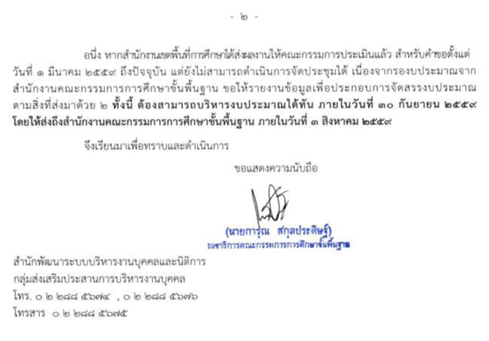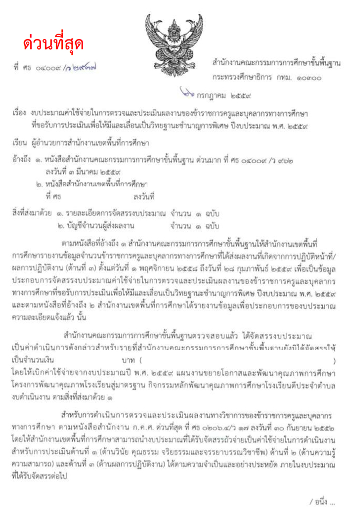 ด่วนที่สุด ที่ ศธ 04009/ว2937 วันที่ 26 กรกฎาคม 2559 งบประมาณค่าใช้จ่ายในการตรวจและประเมินผลงานของข้าราชการครูและบุคลากรทางการศึกษาที่ขอรับการประเมินเพื่อให้มีและเลื่อนวิทยฐานะชำนาญการพิเศษ ปีงบประมาณ พ.ศ. 2559
