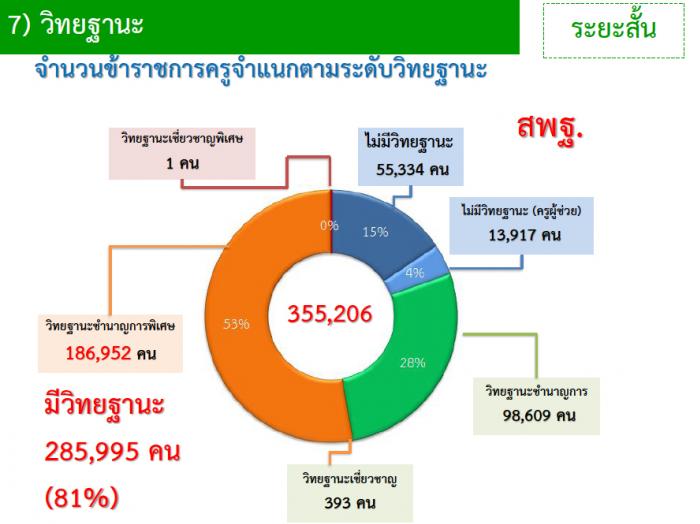 ข้อมูลจาก สไลด์ประกอบบรรยาย "การผลิตครูเพื่อปฏิรูปการเรียนรู้สู่อนาคตการศึกษาไทย" โดย พล.อ.ดาว์พงษ์ รัตนสุวรรณ รัฐมนตรีว่าการกระทรวงศึกษาธิการ ณ มหาวิทยาลัยศรีนครินทรวิโรฒ (มศว) ประสานมิตร เมื่อวันพุธที่ 27 กรกฎาคม 2559