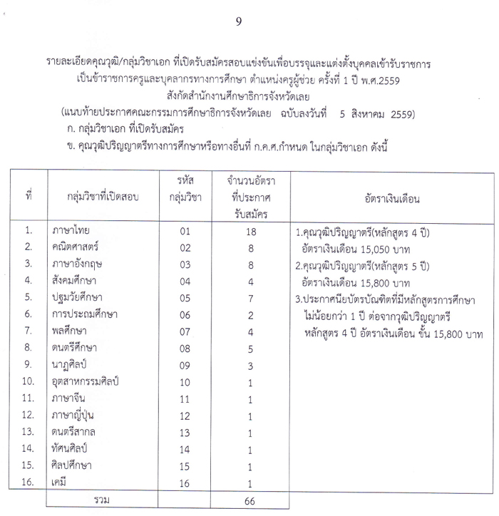 ประกาศคณะกรรมการศึกษาธิการจังหวัดเลย เรื่อง รับสมัครสอบแข่งขันเพื่อบรรจุและแต่งตั้งบุคคลเข้ารับราชการเป็นข้าราชการครู และบุคลากรทางการศึกษาตำแหน่ง ครูผู้ช่วย ครั้งที่ 1 ปี พ.ศ.2559 สังกัดสำนักงานเขตพื้นที่การศึกษา ในสำนักงานศึกษาธิการจังหวัดเลย