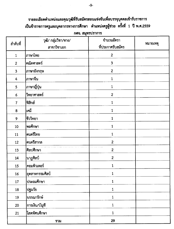 กศจ.สมุทรปราการ รับสมัครสอบแข่งขันเพื่อบรรจุบุคคลเข้ารับราชการข้าราชการครูและบุคลากรทางการศึกษา ตำแหน่งครูผู้ช่วย ครั้งท่ี 1 ปี พ.ศ.2559
