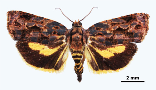 รักษาการ ผอ.อพวช. กล่าวต่อว่า ชนิดต่อมาคือ “ผีเสื้อรัตติสิริน” หรือ ผีเสื้อกลางคืนขนาดเล็ก ค้นพบในพื้นที่สถานีวิจัยสัตว์ป่าฮาลาบาลา จ.นราธิวาส เป็นผีเสื้อเฉพาะถิ่นของประเทศไทย พบเพียงแห่งเดียวที่ จ.นราธิวาส ลักษณะผีเสื้อกลางคืน ปีกแผ่กว้างเพียง 1.6 มม. ปีกคู่หน้ามีแต้มสีเทาปนน้ำเงินสลับกับแต้มสีน้ำตาลดำกระจายทั่วปีก ปีกคู่หลังมีสีเหลืองตรงกึ่งกลางปีก และแถบยาวสีเหลืองบริเวณโคนปีกบน พื้นปีกสีน้ำตาลเข้ม ขอบปีกสีเหลือง ปล้องท้องสีดำสลับเหลือง ถือเป็นผีเสื้อกลางคืนที่มีสีสันสวยงามที่สุด