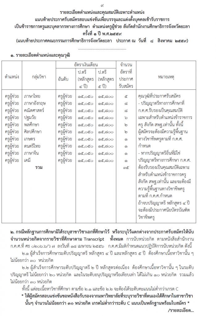 ด้วยคณะกรรมการศึกษาธิการจังหวัดยะลา ได้ประกาศรับสมัครสอบแข่งขันเพื่อบรรจุและแต่งตั้งบุคคลเข้ารับราชการเป็นข้าราชการครูและบุคลากรทางการศึกษา ตำแหน่งครูผู้ช่วย สังกัดสำนักงานศึกษาธิการจังหวัดยะลา ครั้งที่ ๑ ปีพ.ศ.๒๕๕๙ จำนวน ๑๐ กลุ่มวิชา ๓๕ อัตรา รับสมัครระหว่างวันที่ ๑๕-๒๑ สิงหาคม ๒๕๕๙ ในเวลาราชการ (ไม่เว่้นวันหยุดราชการ) ณ สำนักงานเขตพื้นที่การศึกษาประถมศึกษายะลา เขต ๑ สามารถดาวน์โหลดใบสมัครเพื่อกรอกรายละเอียดในใบสมัครได้ แต่การลงลายมือชื่อในใบสมัคร ให้เว้นไว้ก่อน และให้ลงลายมือชื่อสมัครในใบสมัครต่อหน้าเจ้าหน้าที่รับสมัครเท่านั้น