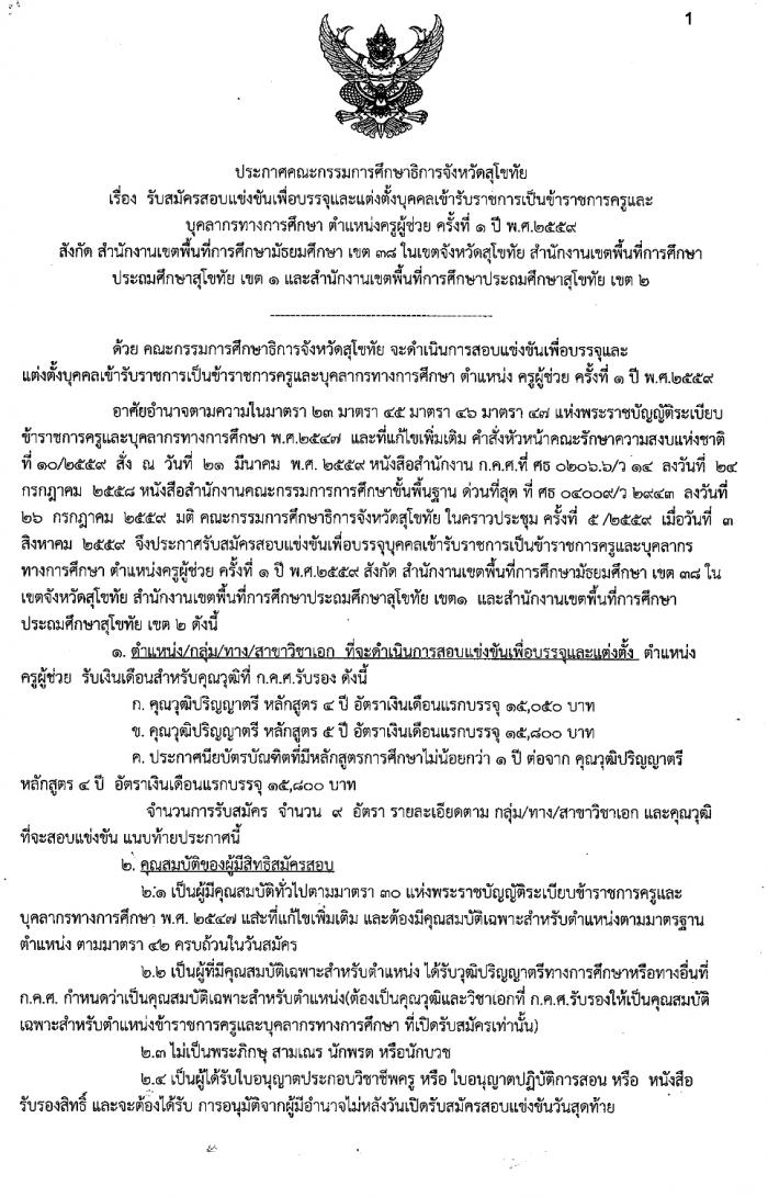 กศจ.สุโขทัย รับสมัครสอบแข่งขันเพื่อบรรจุบุคคลเข้ารับราชการข้าราชการครูและบุคลากรทางการศึกษา ตำแหน่งครูผู้ช่วย ครั้งท่ี 1 ปี พ.ศ.2559