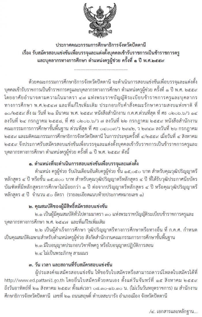 ประกาศคณะกรรมการศึกษาธิการจังหวัดปัตตานี เรื่อง การดำเนินการสอบแข่งขันเพื่อบรรจุและแต่งตั้งบุคคล เข้ารับราชการเป็นข้าราชการครูและบุคลากรทางการศึกษา ตำแหน่งครูผู้ช่วย ครั้งที่ 1 ปี พ.ศ.2559