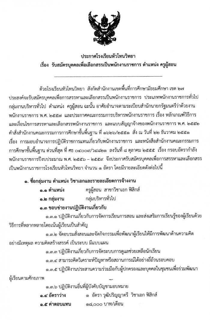 โรงเรียนหัวโทนวิทยา ประกาศรับสมัครพนักงานราชการ ตำแหน่งครูผู้สอน