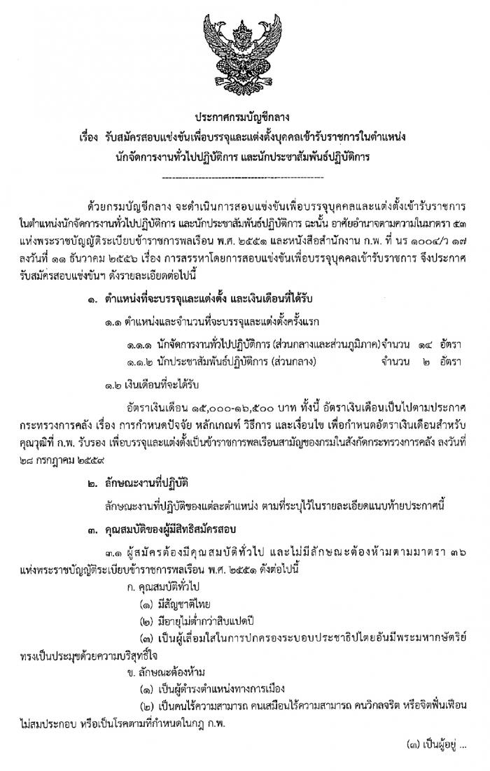 ประกาศกรมบัญชีกลาง เรื่อง รับสมัครสอบแข่งขันเพื่อบรรจุและแต่งตั้งบุคคลเข้ารับราชการในตำแหน่งนักจัดการงานทั่วไปปฏิบัติการ และนักประชาสัมพันธ์ปฏิบัติการ