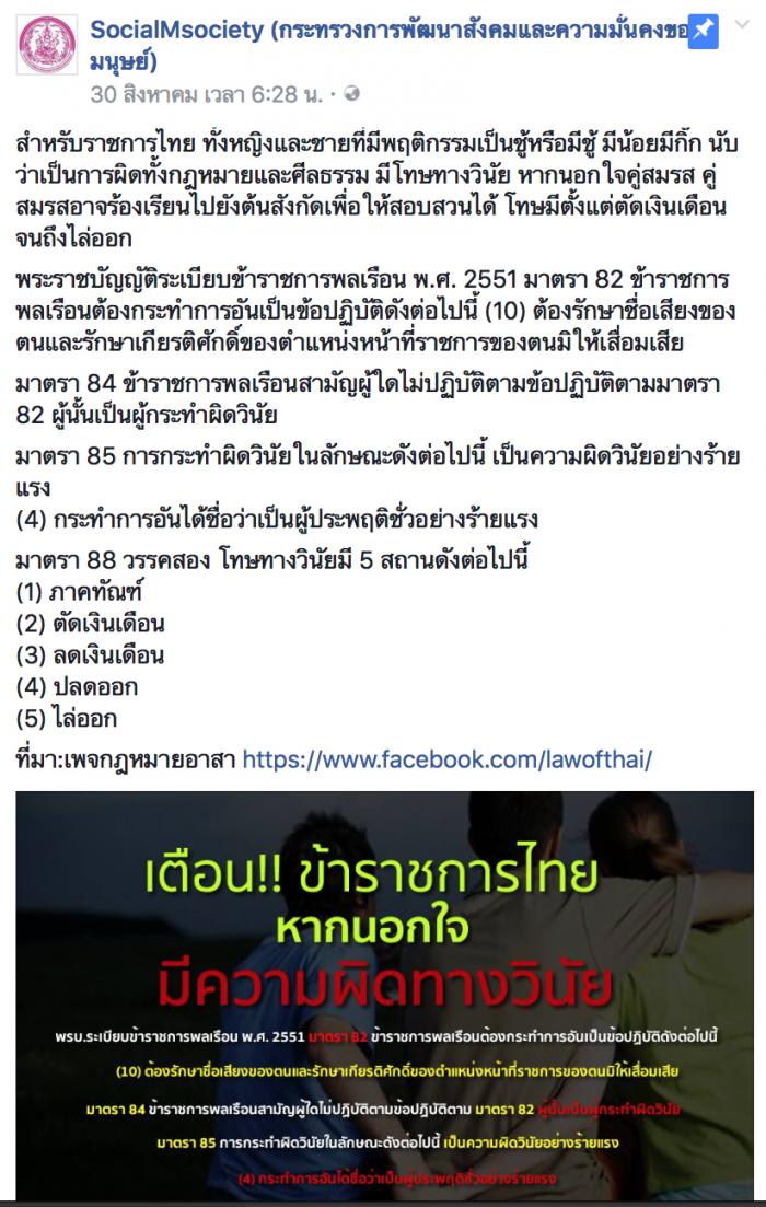 เมื่อวันที่ 30 สิงหาคม 2559 เพจ SocialMsociety (กระทรวงการพัฒนาสังคมและความมั่นคงของมนุษย์) ได้เผยแพร่ข้อมูล ที่มีรายละเอียด ดังนี้