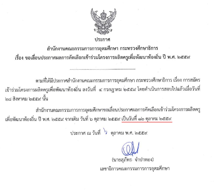 ล่าสุด 6 ตุลาคม 2559 สำนักงานคณะกรรมการการอุดมศึกษา ได้ประกาศ ขอเลื่อนวันประกาศผลการคัดเลือกเข้าร่วมโครงการผลิตครูเพื่อพัฒนาท้องถิ่น ปี พ.ศ.2559 ออกไป เป็นวันที่ 12 ตุลาคม 2559 รายละเอียด ดังนี้ครับ