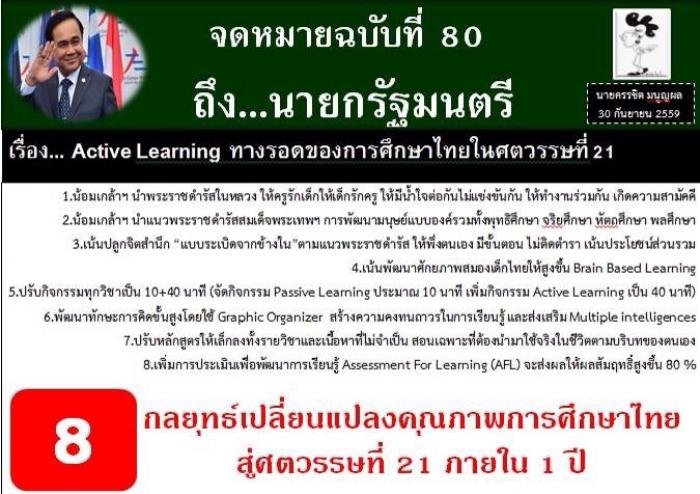 จดหมายฉบับที่ 80 ถึงนายกรัฐมนตรี เรื่อง Active Learning ทางรอดของการศึกษาไทยในศตวรรษที่ 21 โดย ครรชิต มนูญผล