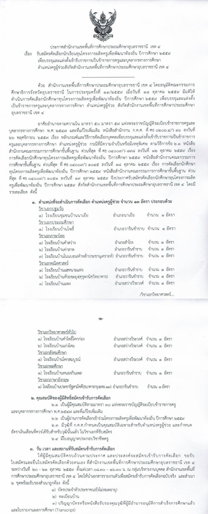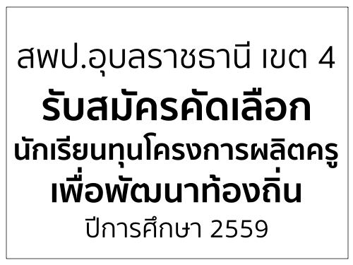 ประกาศ สพป.อุบลราชธานี เขต 4 เรื่อง รับสมัครคัดเลือกนักเรียนทุนโครงการผลิตครูเพื่อพัฒนาท้องถิ่น ปีการศึกษา 2559