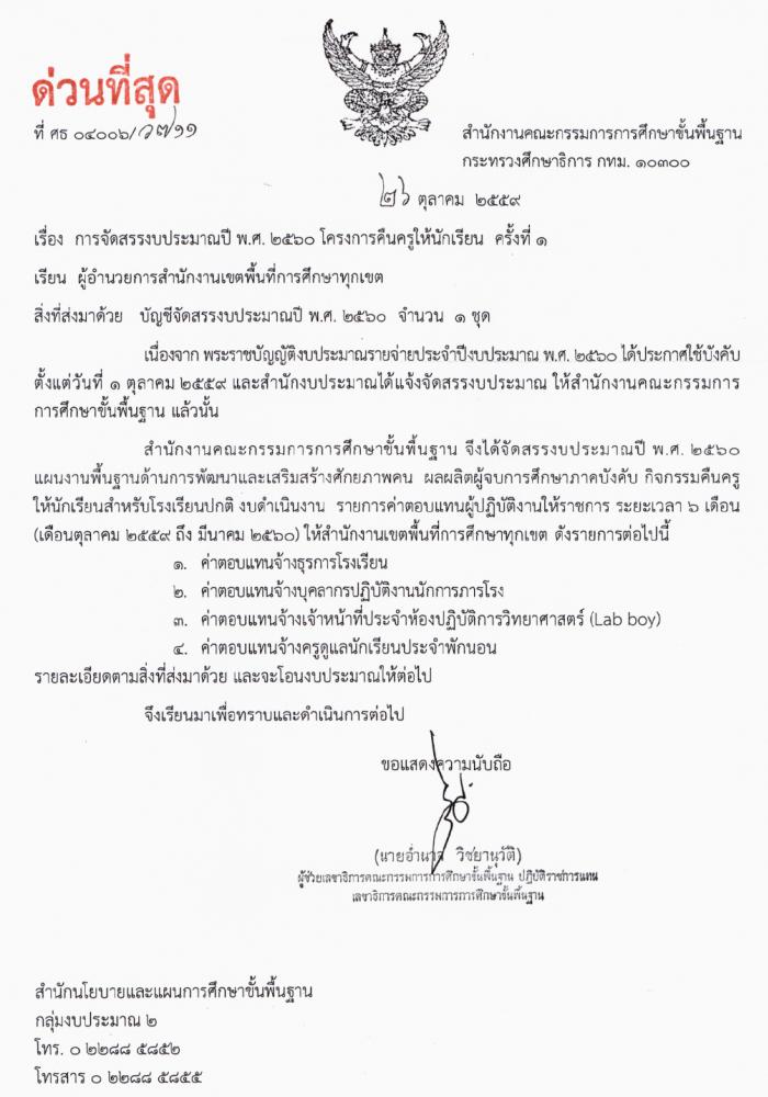 การจัดสรรงบประมาณปี พ.ศ. 2560 โครงการคืนครูให้นักเรียน ครั้งที่ 1
