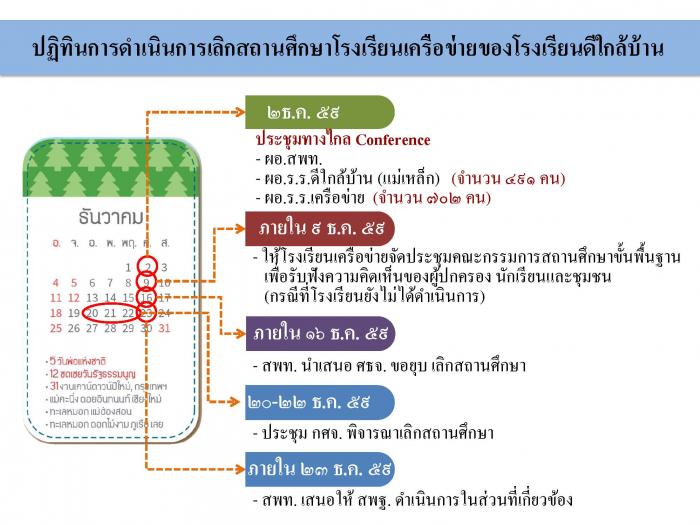 สำนักงานคณะกรรมการการศึกษาขั้นพื้นฐาน ได้จัดการประชุม Conference โรงเรียนเครือข่าย โครงการโรงเรียนดีใกล้บ้าน (แม่เหล็ก) เมื่อวันที่ 2 ธันวาคม 2559 เวลา 09.00 น. เพื่อกำหนดทิศทางและรายงานผลการดำเนินงานโรงเรียนเครือข่าย จำนวน 702 โรงเรียน โดยข้อมูลจาก PowerPoint การประชุม Conference ในครั้งนี้ ได้มีรายละเอียดเกี่ยวกับปฏิทินการดำเนินการ และ Timeline ในการบริหารจัดการ ดังต่อไปนี้