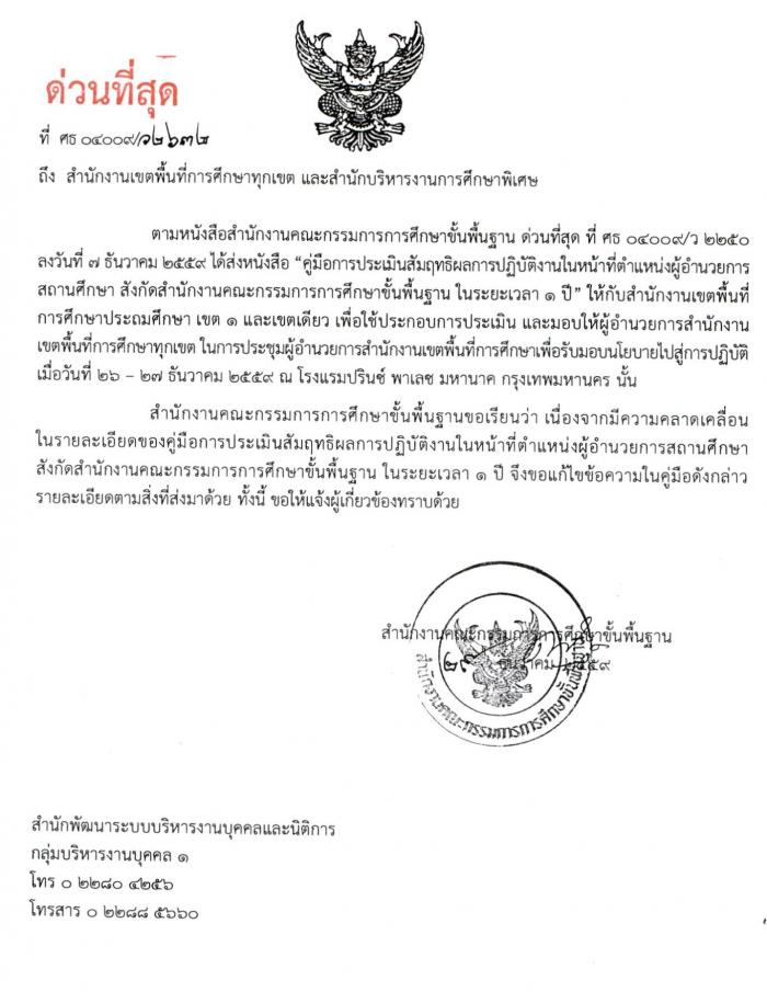 ด่วนที่สุด ที่ ศธ 04009/ว2632 การแก้ไขข้อความในคู่มือการประเมินสัมฤทธิผลการปฏิบัติงานในหน้าที่ตำแหน่งผู้อำนวยการสถานศึกษา สังกัด สพฐ.ในระยะเวลา 1 ปี