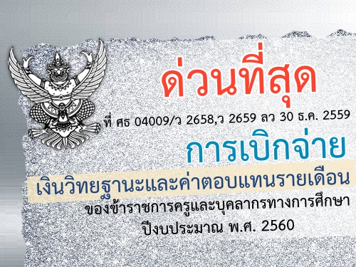 ด่วนที่สุด ที่ ศธ 04009/ว 2658,ว 2659 ลงวันที่ 30 ธันวาคม 2559 เรื่อง การเบิกจ่ายเงินวิทยฐานะและค่าตอบแทนรายเดือนของข้าราชการครูและบุคลากรทางการศึกษา ปีงบประมาณ พ.ศ. 2560