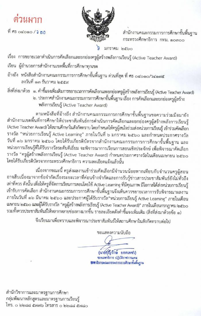 สำนักงานคณะกรรมการการศึกษาขั้นพื้นฐาน ขยายเวลารับสมัครครูผู้จัดการเรียนการสอนโดยใช้ Active Learning ที่มีคุณภาพ ส่งผลงานหน่วยการเรียนรู้เพื่อเข้ารับการคัดเลือกรับรางวัล “ครูผู้สร้างพลังการเรียนรู้ (Active Teacher Award)” จากเดิมภายใน 6 ม.ค.2560 เป็น ภายในวันที่ 16 มีนาคม 2560 และจะประกาศผู้ได้รับรางวัล “หน่วยการเรียนรู้ Active Learning” ภายในเดือน เมษายน 2560 และจะพิจารณาการเรียนการสอนเชิงประจักษ์ เพื่อพิจารณาคัดเลือกรางวัล “ครูผู้สร้างพลังการเรียนรู้ (Active Teacehr Award)” และประกาศผลภายในเดือน กรกฎาคม 2560 นี้