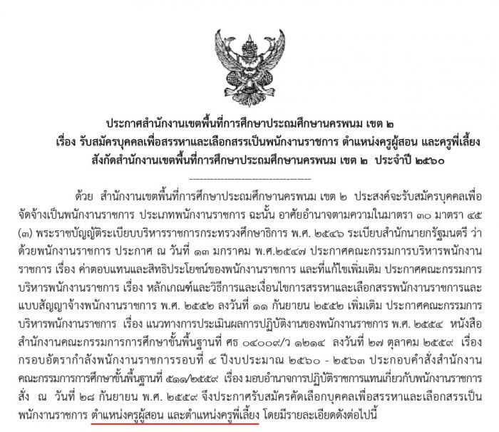 สำนักงานเขตพื้นที่การศึกษาประถมศึกษานครพนม เขต 2 ประกาศรับสมัครบุคคลเพื่อสรรหาและเลือกสรรเป็นพนักงานราชการ ตำแหน่งครูผู้สอน และครูพี่เลี้ยง สังกัดสำนักงานเขตพื้นที่การศึกษาประถมศึกษานครพนม เขต 2 ประจำปี 2560