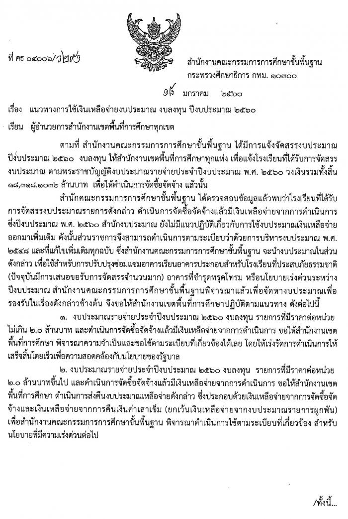 แนวทางการใช้เงินเหลือจ่ายงบประมาณ งบลงทุน ปีงบประมาณ 2560