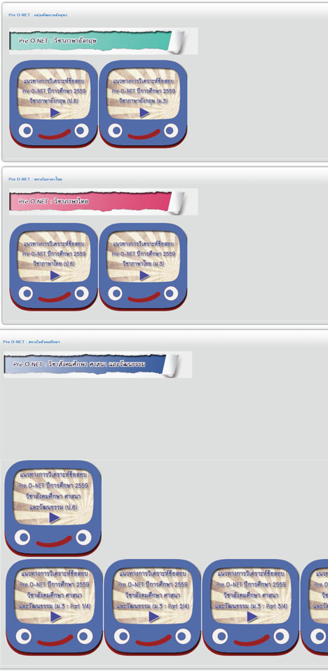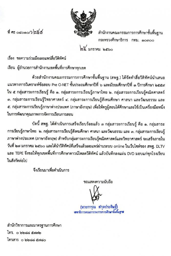 ตามที่ สพฐ.ได้จัดส่งข้อสอบ Pre O-net ซึ่งเป็นข้อสอบที่ออกตามตัวชี้วัดที่ใช้กำหนด Test Blueprint ของข้อสอบ O-net ปีการศึกษา 2559 เพื่อให้โรงเรียนได้ทดสอบและทบทวนความรู้นักเรียนชั้นป.6 ม.3,และม.6 ขณะนี้ สพฐ.ได้จัดทำ VTR อธิบายความรู้และวิธีคิดในการทำข้อทดสอบ Pre O-net เสร็จเรียบร้อยแล้ว จึงขอความกรุณาเขตพื้นที่ได้ดาวโหลดไฟล์คำอธิบายดังกล่าวบันทึกลงแผ่นCD เพื่อแจกแก่สถานศึกษาในสังกัดทุกแห่ง และกำชับให้สถานศึกษานำแผ่น CD ดังกล่าวไปใช้ประโยชน์ในการพัฒนานักเรียน ก่อนที่จะสอบ O-net โดยขอให้คุณครูพิจารณาใช้ CD ให้เหมาะสมกับความแตกต่างและความสามารถในการเรียนรู้ของนักเรียน ตลอดจนเปิดโอกาสให้นักเรียนได้เรียนรู้จนเกิดความรู้ความเข้าใจทุกคนตามความต้องการและสนใจของนักเรียน สพฐ.ไม่สงวนลิขสิทธิ์ในการที่สถานศึกษาจะสำเนา CD ให้นักเรียนไปศึกษาด้วยตนเองเป็นรายบุคคลทั้งที่สถานศึกษาและที่บ้าน